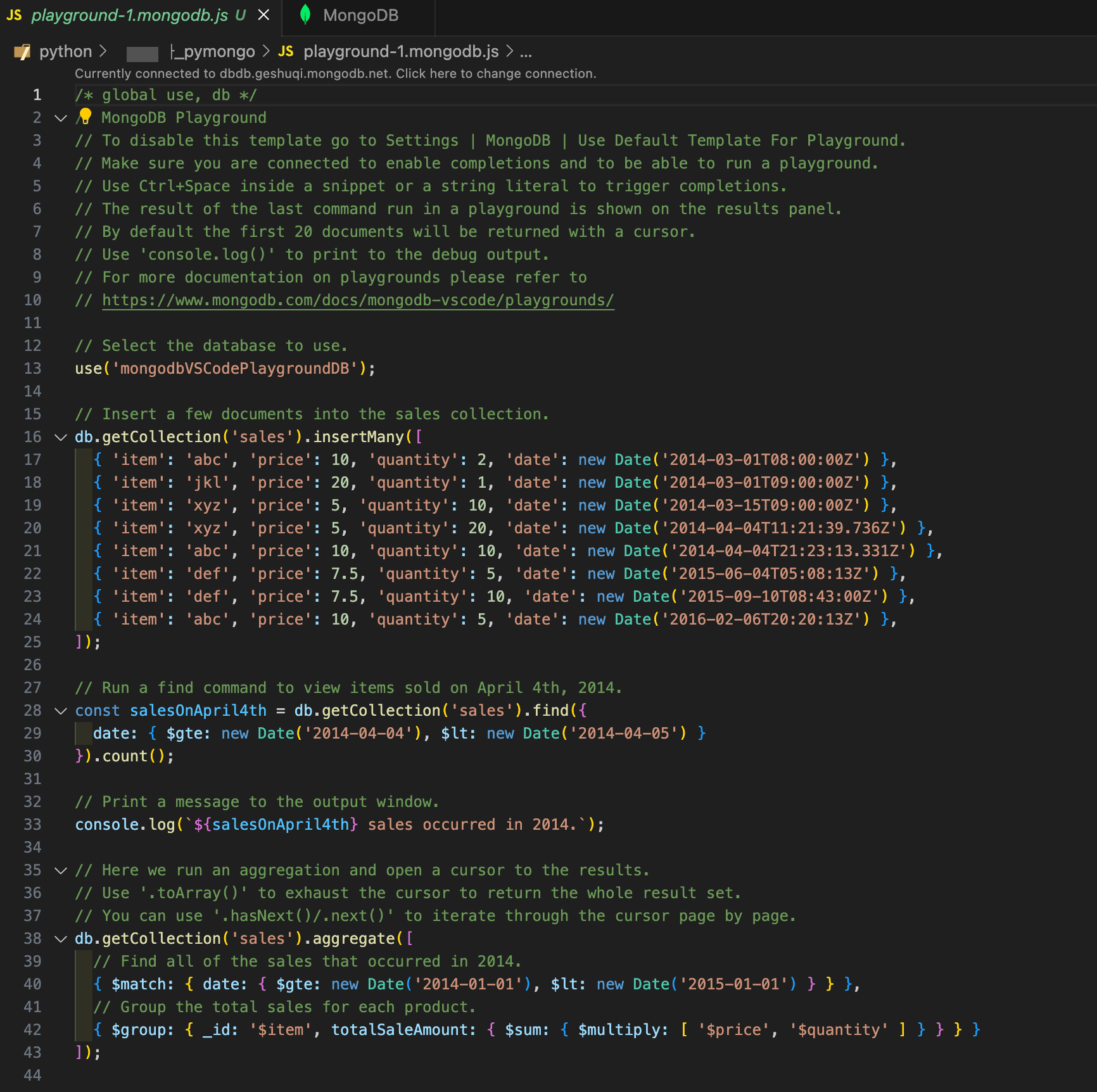 Docs Home → MongoDB for VS Code MongoDB Playgrounds are JavaScript environments where you can prototype queries, aggregations, and MongoDB commands with helpful syntax highlighting.MongoDB Playgrounds provide intelligent autocomplete for:The Mongo Shell