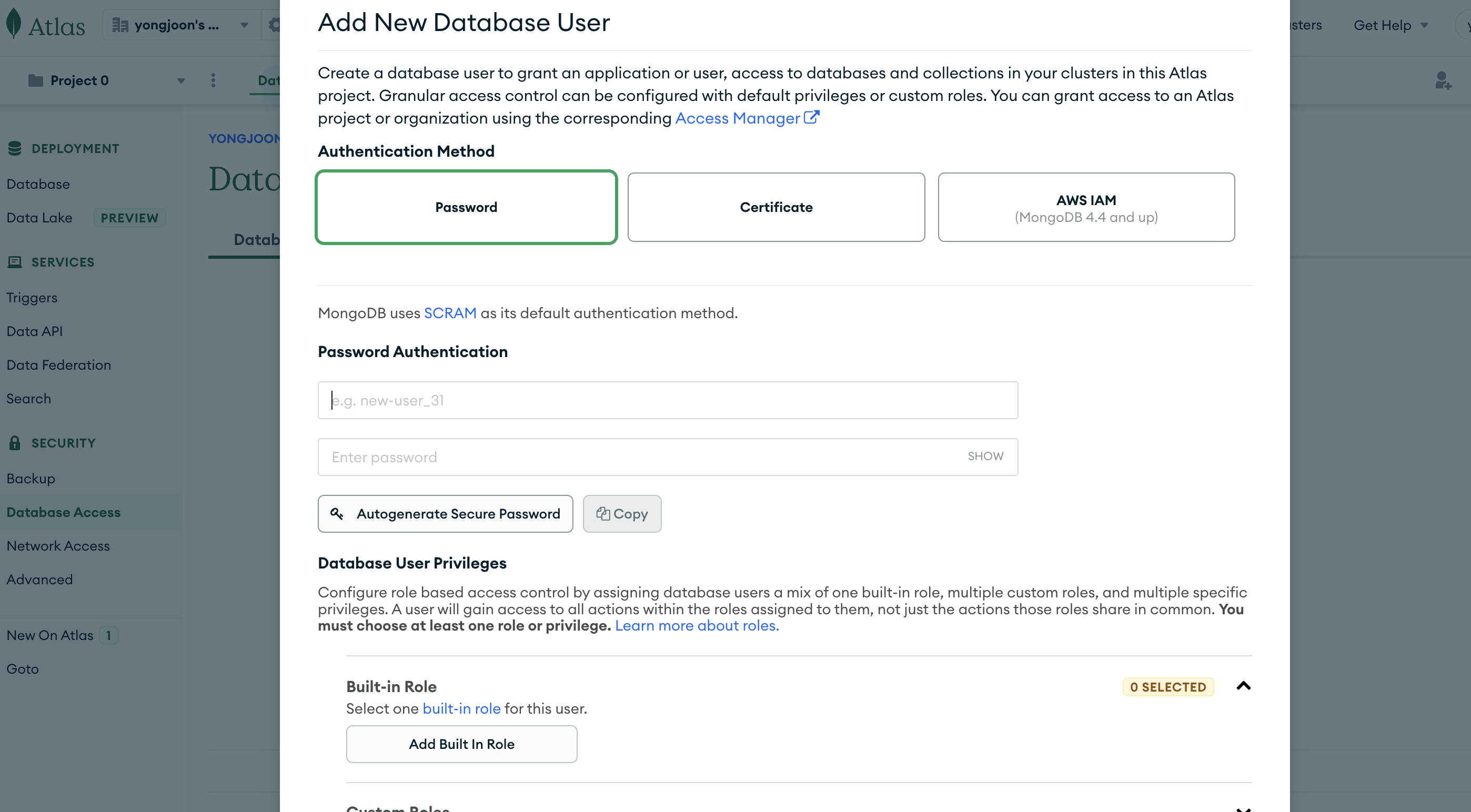 - MongoDB사이트에서, 왼쪽의 "Database Access"클릭
