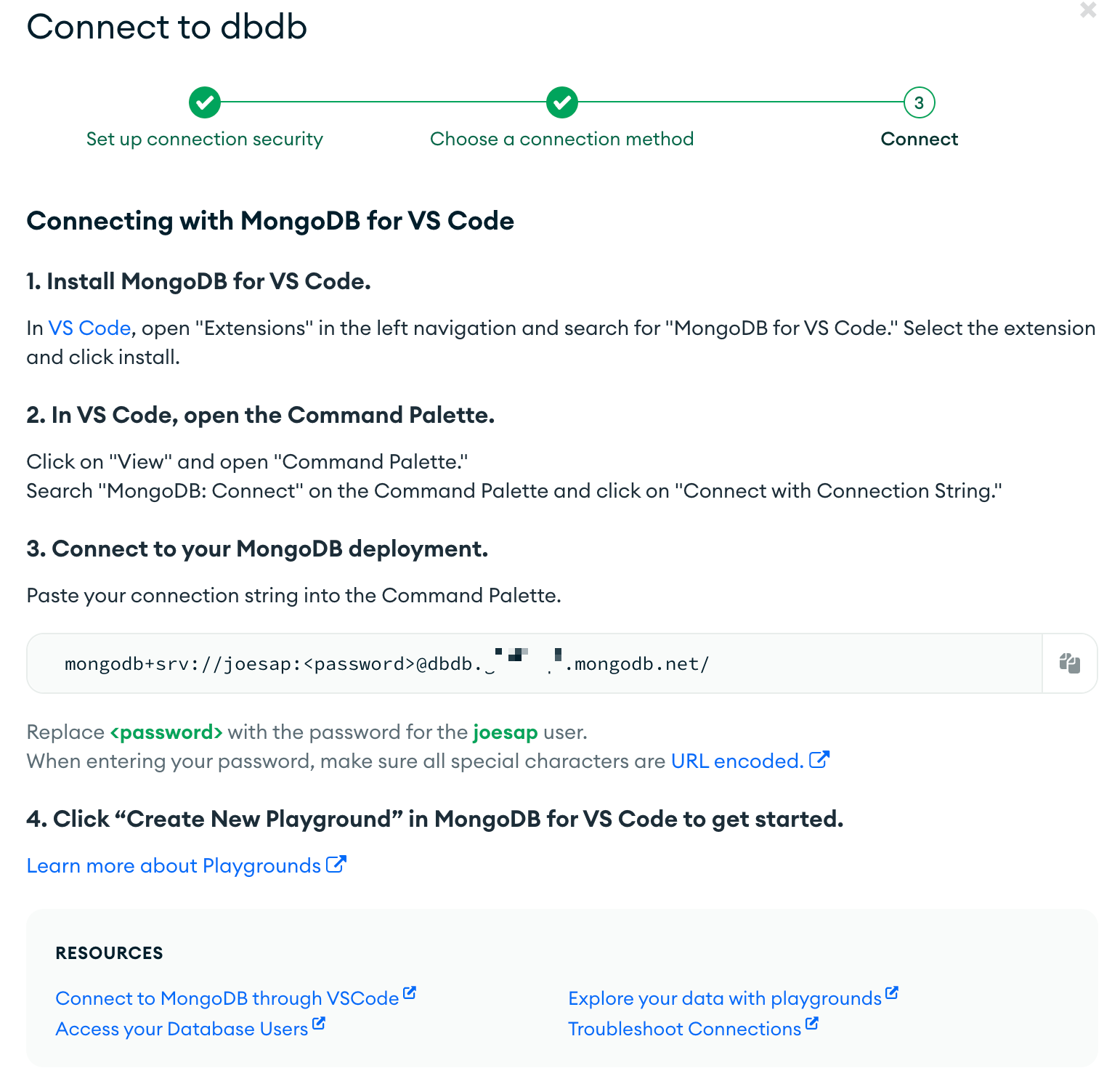 3번의 과정(3. Connect to your MongoDB deployment.)의 코드를 복사한다