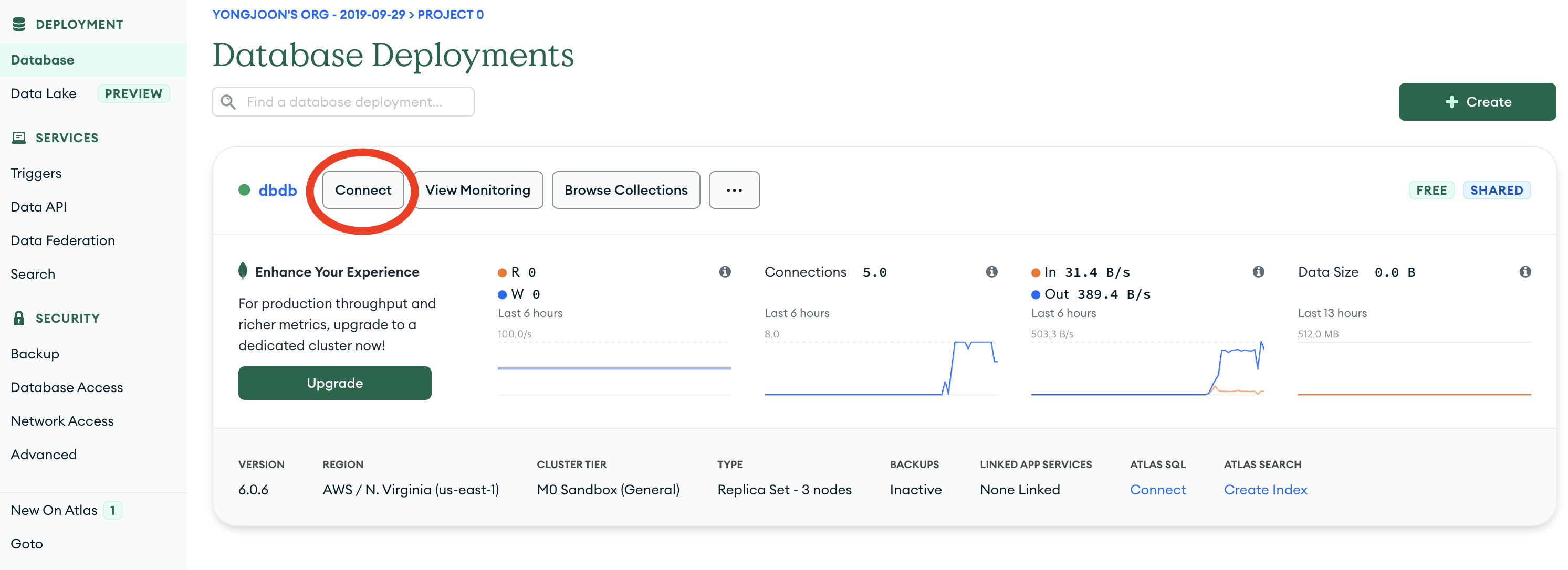 (필자는 다운을 받아놔서, 아이콘이 추가되어있는거임.) - 화면 아래쪽에 위치한 "Create free cluster"를 클릭한다