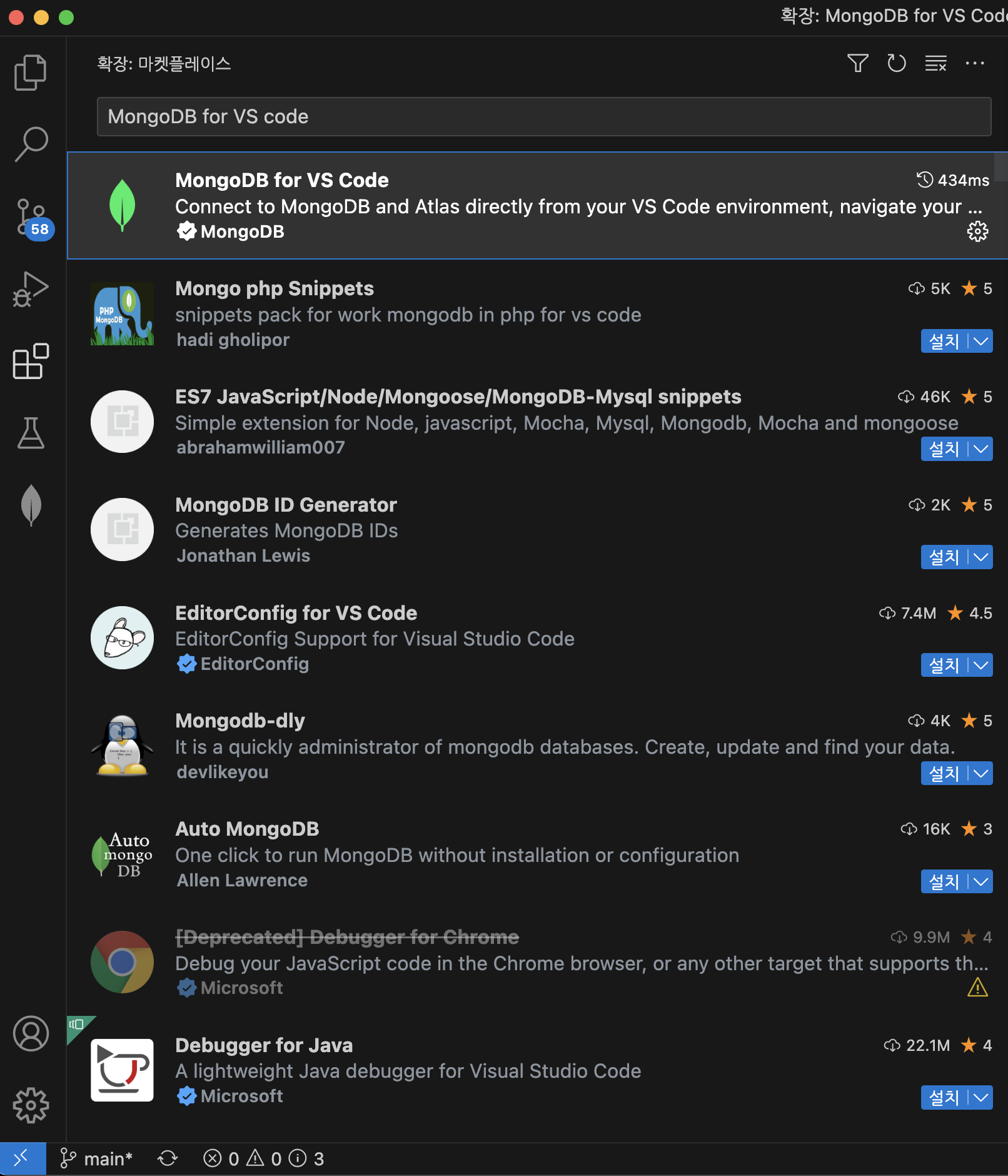 - 왼쪽 아이콘중 Extension marketplace(확장)을 클릭하여, "MongoDB for VS code"를 검색하여 다운 받는다.